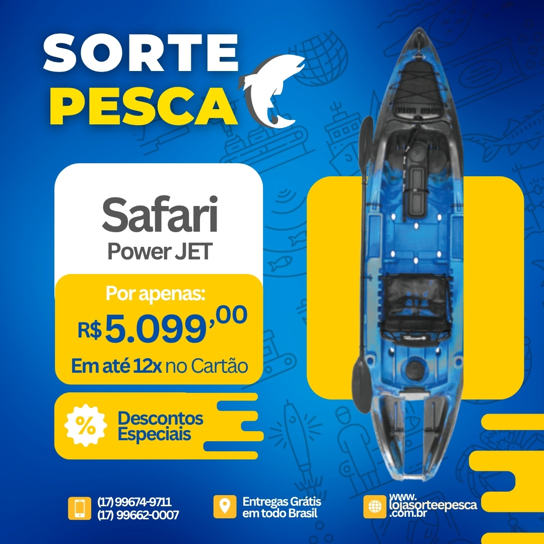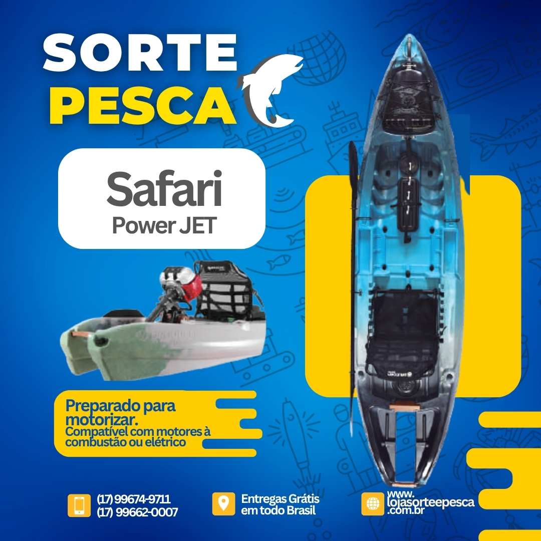 O Caiaque Safari Fishing Power Jet vem com designer inovador e sua hidrodinâmica de alta performance onde levará o pescador nos lugares ainda não descobertos. Sua superfície plana serve como base para suas varas e sua caixa de isca artificial ou até mesmo uma base para manuseio de isca viva.
