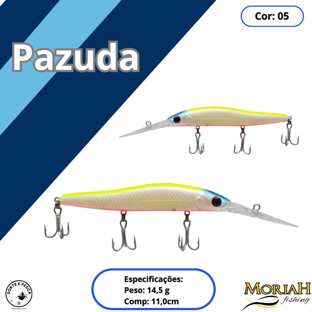 • A isca Pazuda Moriah (Floating) é um verdadeiro coringa na caixa de pesca. Apesar da barbela longa, seu excelente sistema de balanceamento garante ótimos arremessos. Ideal para dias frios e em profundidades maiores, permite diversas técnicas: toques de ponta de vara, recolhimento contínuo e pausa, onde, ao parar, sobe de ré, evitando enroscos e instigando os peixes para emoções intensas.